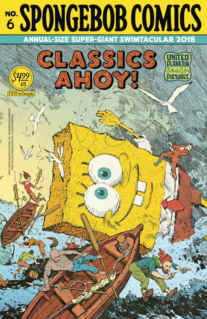 Why are SpongeBob, Patrick, Squidward, and Mr. Krabs starring in a Bikini Bottom mashup of 20,000 Leagues Under the Sea, Treasure Island, Moby-Dick, and more maritime masterpieces? It’s simple: The dread Censor Ship has ordered SpongeBob Comics‘ creative crew, the United Plankton pirates, to clean up their act – or walk the plank! Henceforth, all SpongeBob Comics must be educational and literary, to boot! But as SpongeBob and friends go on their highfalutin’ quest through a bunch of literary rip-offs-er, homages, the true spirit of SpongeBob sneaks its way into the narrative – in the form of Patrick and SpongeBob’s new silly Squishy Dance!