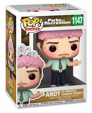This Parks and Recreation Andy as Princess Rainbow Sparkle Pop! Vinyl Figure measures approximately 3 3/4-inches tall. Comes packaged in a window display box.