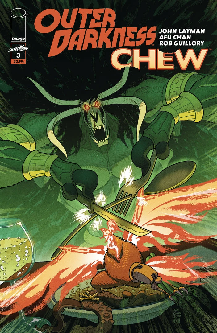 Our crossover concludes as CHEW’s culinary crazies and OUTER DARKNESS’s cosmic cutthroats go head-to-head in a gory, blood-soaked climax. Not a reboot, dream, or imaginary story. Witness the very last adventure of Tony Chu and the CHEW crew…in spaaaaaace!!!