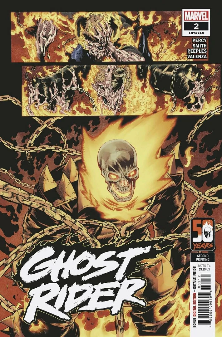 Johnny Blaze has the perfect life: a wife and two kids, a job at an auto repair shop and a small-town community that supports him… But Johnny isn’t doing well. He has nightmares of monsters when he sleeps. And he sees bloody visions when he’s awake. This life is beginning to feel like a prison. And there’s a spirit in him that’s begging to break out! Benjamin Percy (WOLVERINE, X-FORCE) and Cory Smith (CONAN THE BARBARIAN, CAPTAIN MARVEL) are going back to basics with the Spirit of Vengeance in this extra-sized first issue!