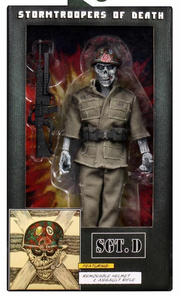 Straight from the cover of S.O.D.’s satirical metal album, the band’s Sgt. D character comes to life as a clothed action figure. Standing 8 inches tall, the figure comes with removable helmet and rifle accessory.