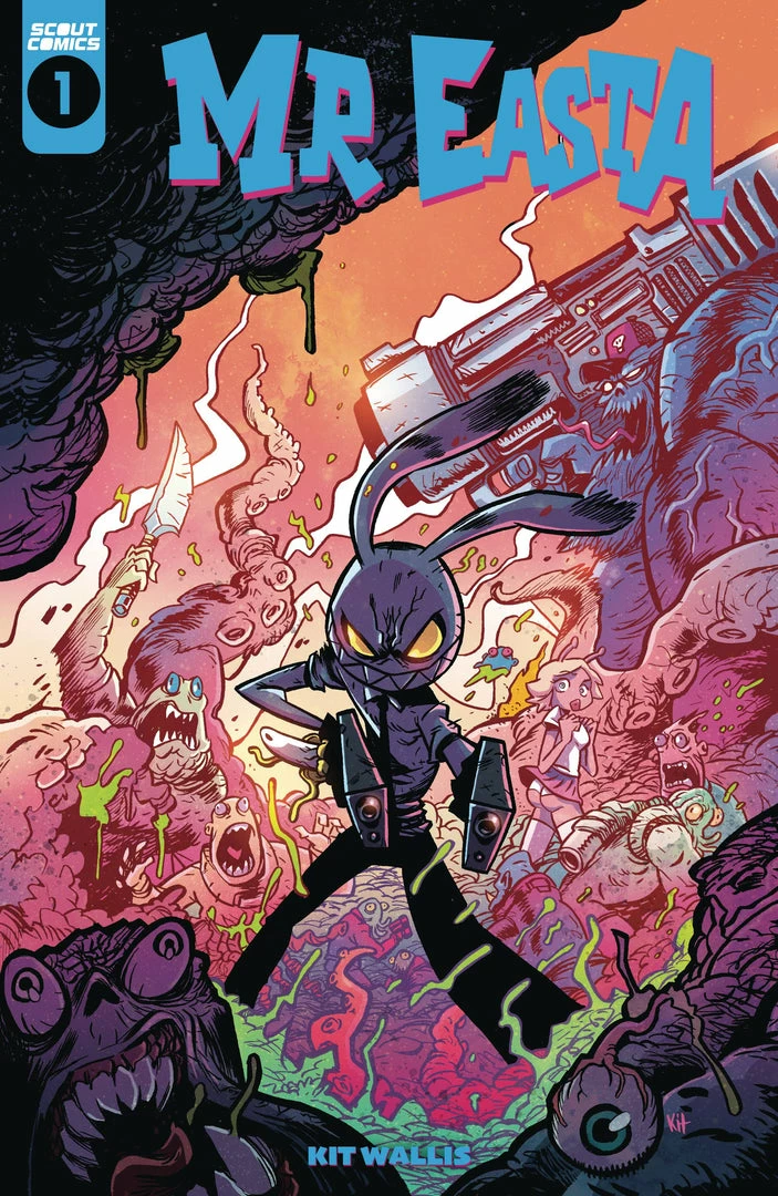 The gloriously demented mind of Kit Wallis brings the galactic adventures of the third best assassin in the universe to Scout Comics! Incredible, kinetically charged artwork blasts the blood, mayhem and quirky humor directly through your brain like a high-caliber bullet. In this issue, it’s Elvis night at an interstellar backwater bar, but with all due respect to the King, that doesn’t stop Mr. Easta. With the help of Frank, his teleportation parasite, who can also transform into any handheld weapon imaginable, it’s business as usual.